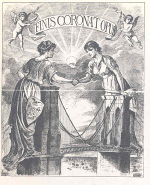 This political cartoon celebrating the opening of the Brooklyn Bridge satirizes how the cities of New York and Brooklyn looked at the impact of the bridge. The Brooklyn newspapers called the opening of the bridge to be a “marriage” between the two cities while the New York newspapers said it was only an “engagement.”