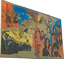 Inscribed with the words “Our Strength Is Our Heritage, Our Heritage Is Our Life” this mural was painted on an office building at 232 East Broadway east of Clinton Street. The left side depicted Lower East Side history: Ellis Island immigration, the dawn of the labor movement and the sweatshops, the early importance of The Forward newspaper depicting the masthead at its then weekly price of twenty cents. . The middle section was devoted to religion: a rebbe praying, a woman lighting Shabbat candles, a menorah. There was also modern world history: A fire representing the Holocaust, a flag and map of the modern state of Israel, the massacre of Jewish Olympians at the 1972 Summer Olympics at Munich. The far right side of the mural depicted the faces of the teens themselves and their families.