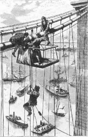 Once the towers of the Brooklyn Brige were in place, cabling the bridge became a major event. All river traffic stopped. Huge crowds watched as the workers labored to connect the cables across the East River. On August 14, 1876, the first slender wire was strung from tower to tower. The headline in the Brooklyn Eagle proclaimed: “Wedded!” while the New York Tribune considered it “an engagement.”